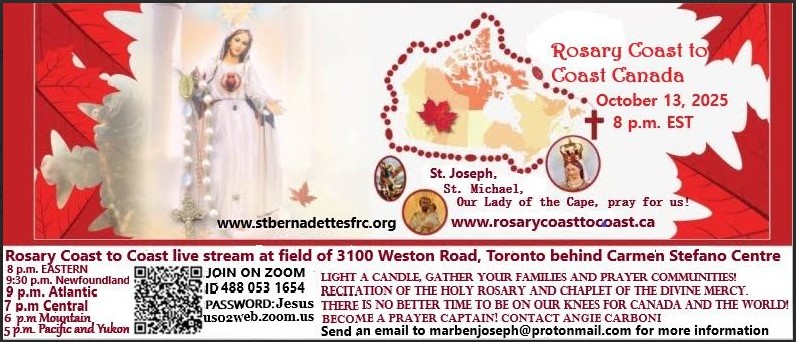 The Rosary Coast to Coast will be livestreamed from 3100 Weston Road, Toronto, Ontario on October 13, 2025, at 8 p.m. EST.
