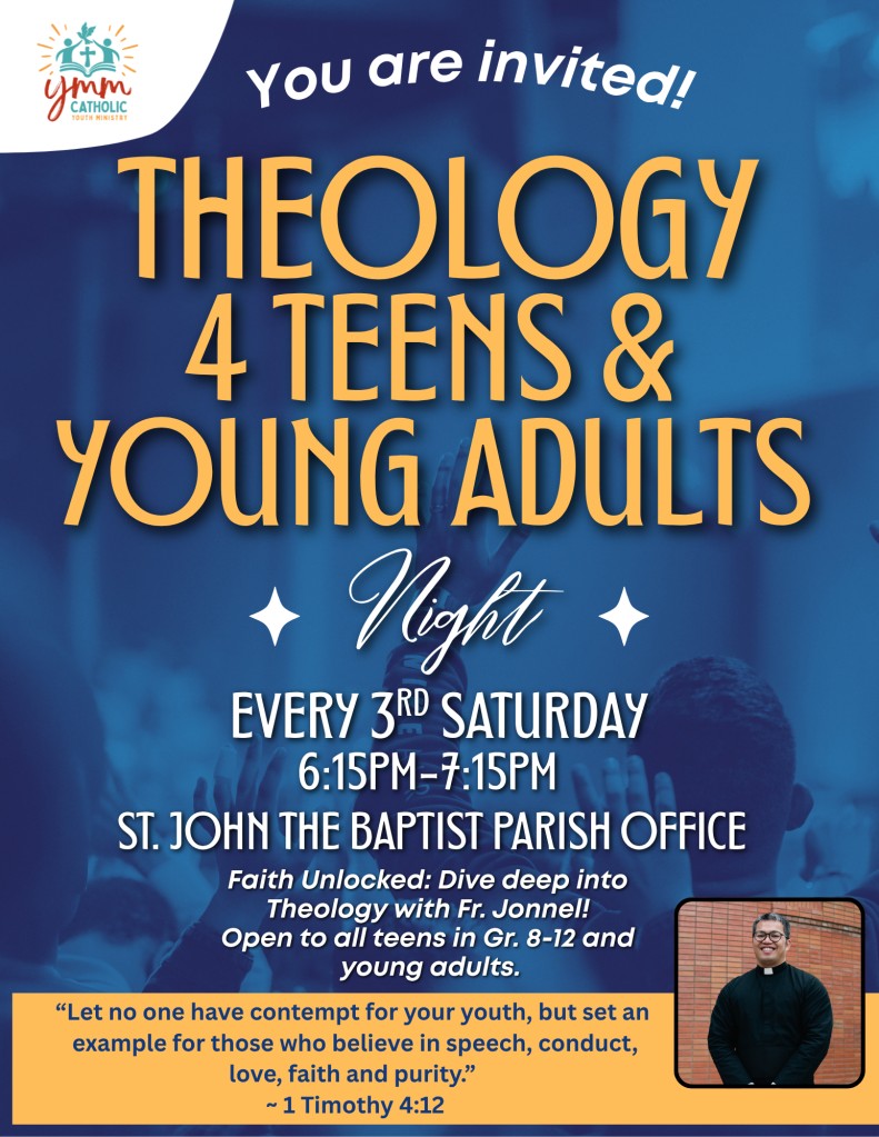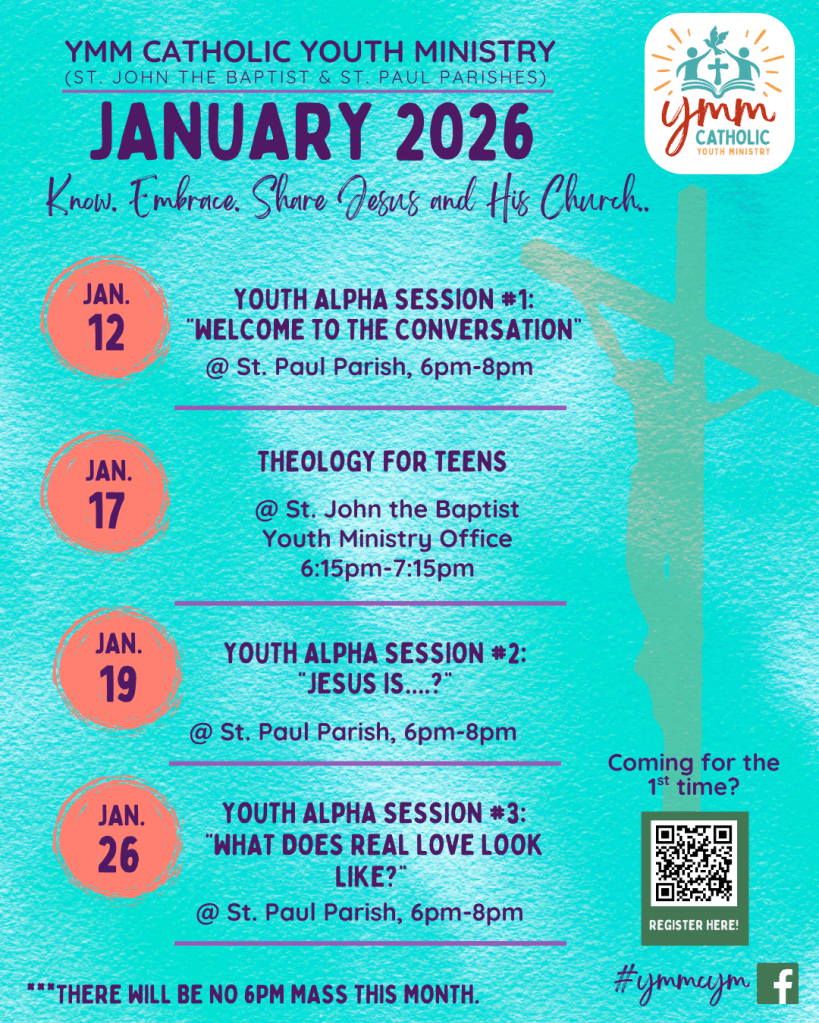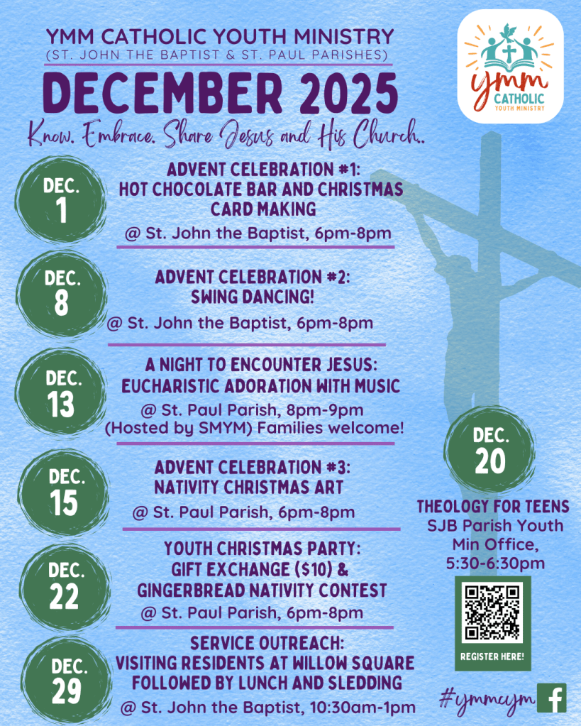 For further inquiries, please contact our Youth Ministry Coordinator, Jennifer MacDonald, or follow us on FB: YMM – Catholic Youth Ministry or Instagram #ymmcym. God bless!”
